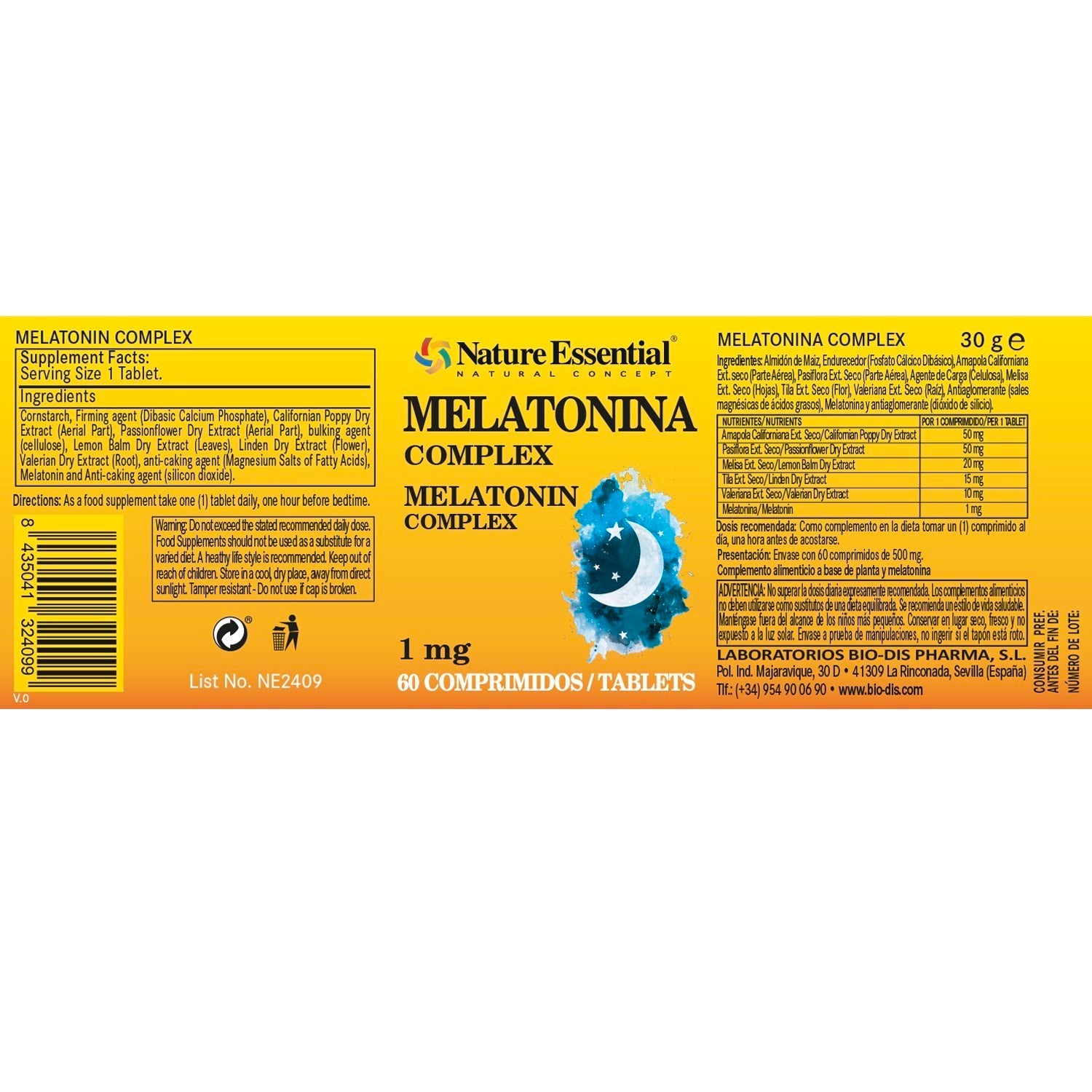 Melatonina complex comprimidos de Nature Essential está formulada con extractos secos de plantas como Valeriana, Amapola Californiana, Melisa, Pasiflora y Tila, además contiene Melatonina. Todos estos componentes tienen propiedades calmantes y nos ayudan a conciliar el sueño, además de combatir los nervios y el estrés. La Melatonina disminuye el tiempo de conciliar el sueño y alivia los síntomas de Jet-lag.