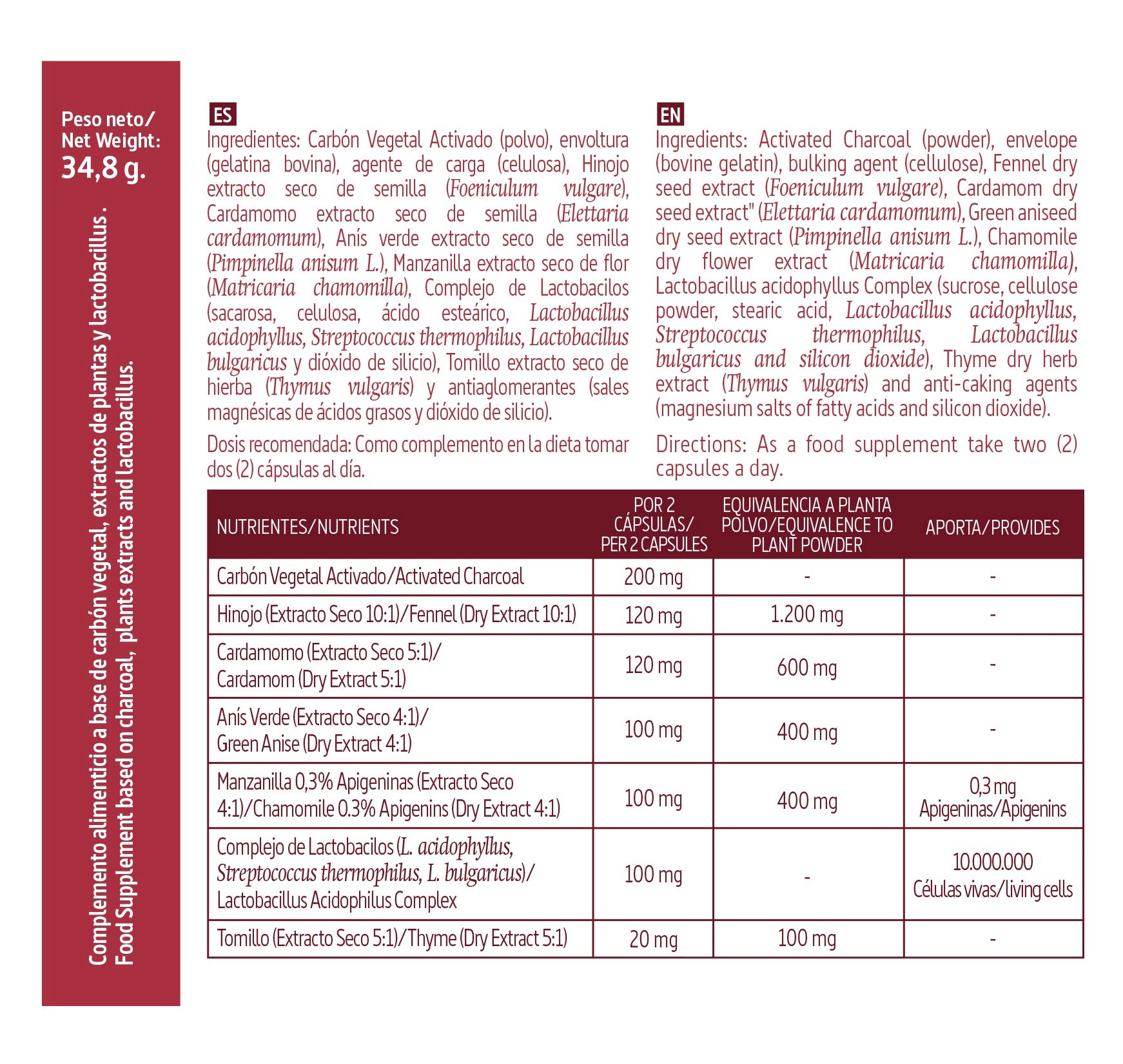Nutrientes activos: Carbón Vegetal Activado, Hinojo extracto seco de semillas (Foeniculum vulgare), Cardamomo extracto seco de semilla (Elettaria cardamomum), Anís verde extracto seco de semillas (Pimpinella anisum L.), Manzanilla extracto seco de flor (Matricaria chamomilla), Lactobacillus acidophyllus Complex (Lactobacillus acidophyllus, Streptococcus thermophilus, Lactobacillus) y Tomillo extracto seco de hierba (Thymus vulgaris). (Ver ficha técnica)
