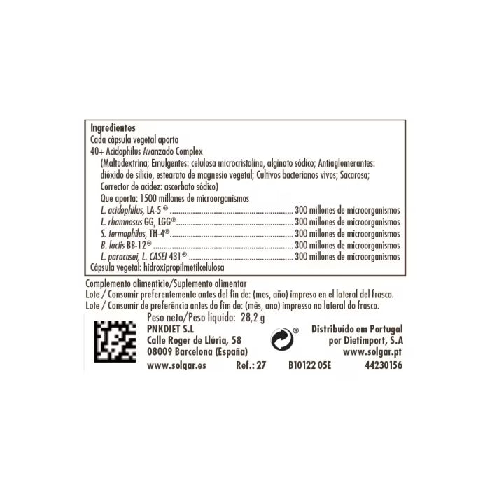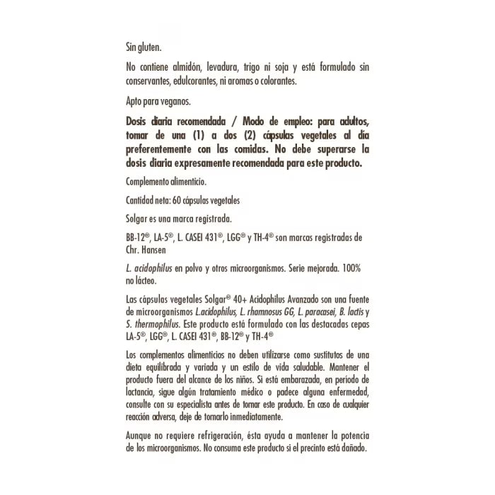 El probiótico 40+ Acidophilus Avanzado aporta, por cápsula, 300 millones de microorganismos de cada una de las cinco cepas bacterianas registradas, especialmente cultivadas: Lactobacillus acidophilus (LA-5®), Lacticaseibacillus rhamnosus GG (LGG®), Lacticaseibacillus paracasei (L. CASEI 431®), Bifidobacterium lactis (BB-12®) y Streptococcus termophilus (TH-4®).