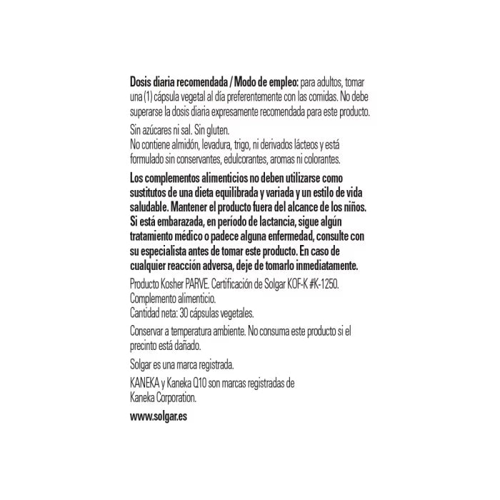 Coenzima Q10 (CoQ-10) 30 mg de Solgar® contiene Kaneka Q-10 ubiquinona, una forma patentada de CoQ-10 fermentada en levadura con alto grado de pureza, que es biológicamente idéntica a la CoQ-10 que produce el organismo.