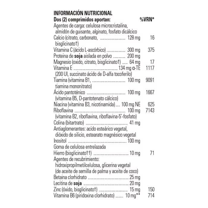 Con alto contenido en vitaminas del complejo B para mantener el nivel de energía, vitamina C para ayudar la función inmune durante y después de la actividad física, y con nutrientes como zinc, cobre o vitamina E que protegen las células del daño oxidativo.