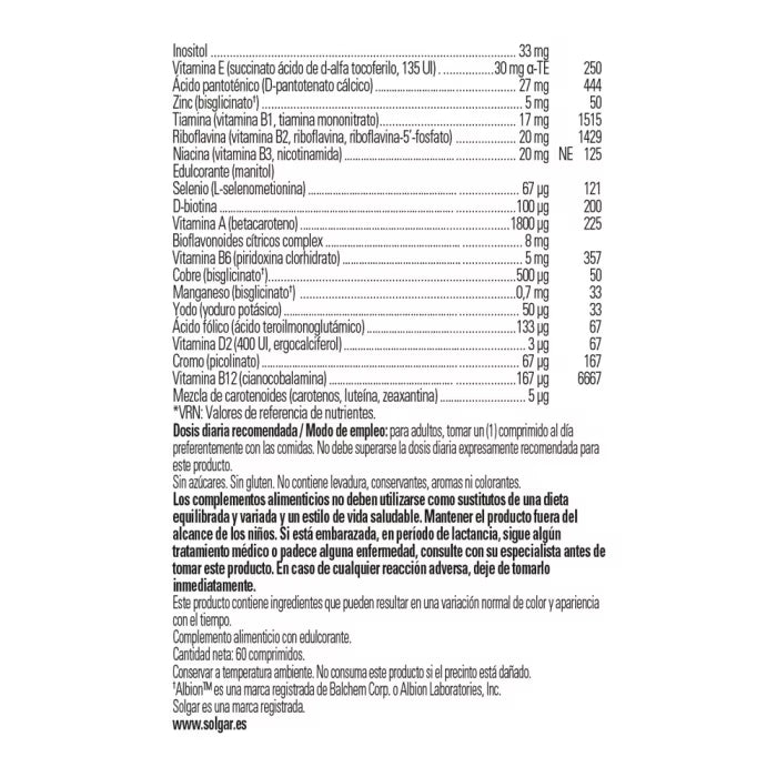 • Las vitaminas B6, B12 y C, la biotina, riboflavina, niacina, tiamina, ácido pantoténico, magnesio, manganeso, calcio, yodo y cobre contribuyen al metabolismo energético normal.