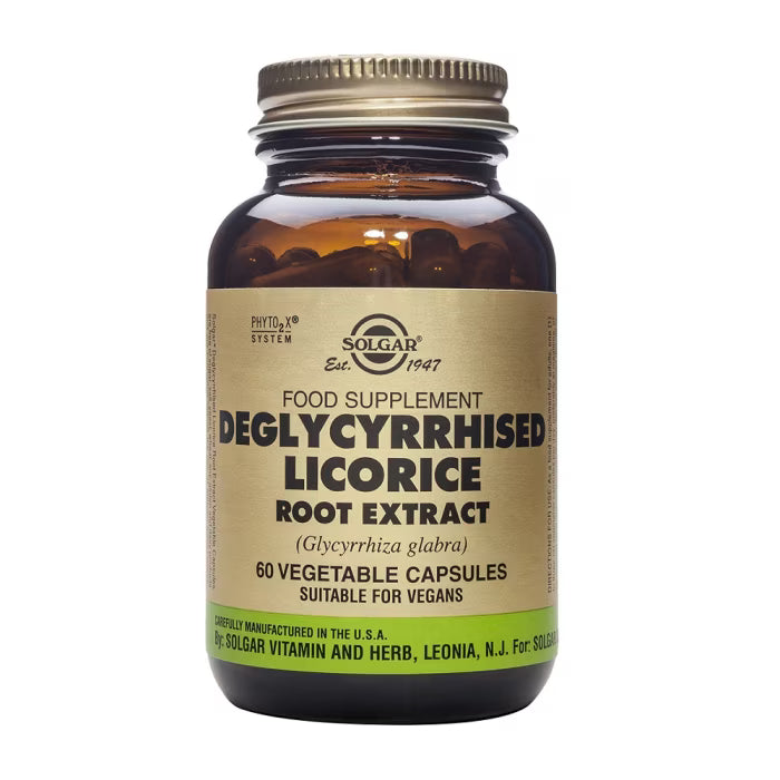 Regaliz Desglicirrizado Extracto de Raíz de Solgar® contiene extracto estandarizado desglicirrizado de raíz de regaliz, con menos del 1% de glicirricina.